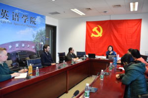 为保障BB贝博双学位/双专业人文通识课程教学质量、落实通识教育目标,打造高质量的“金课”,加强教学经验交流,BB贝博人文通识教研室于12月13日下午1点在西校区国际大厦1016会议室召开教学研讨会。学院副院长仵胜奇、院长助理、人文通识教研室主任廖鸿婧及该组中外教师共7人参加了本次活动。交流会由廖鸿婧主持,工作语言为英语。
