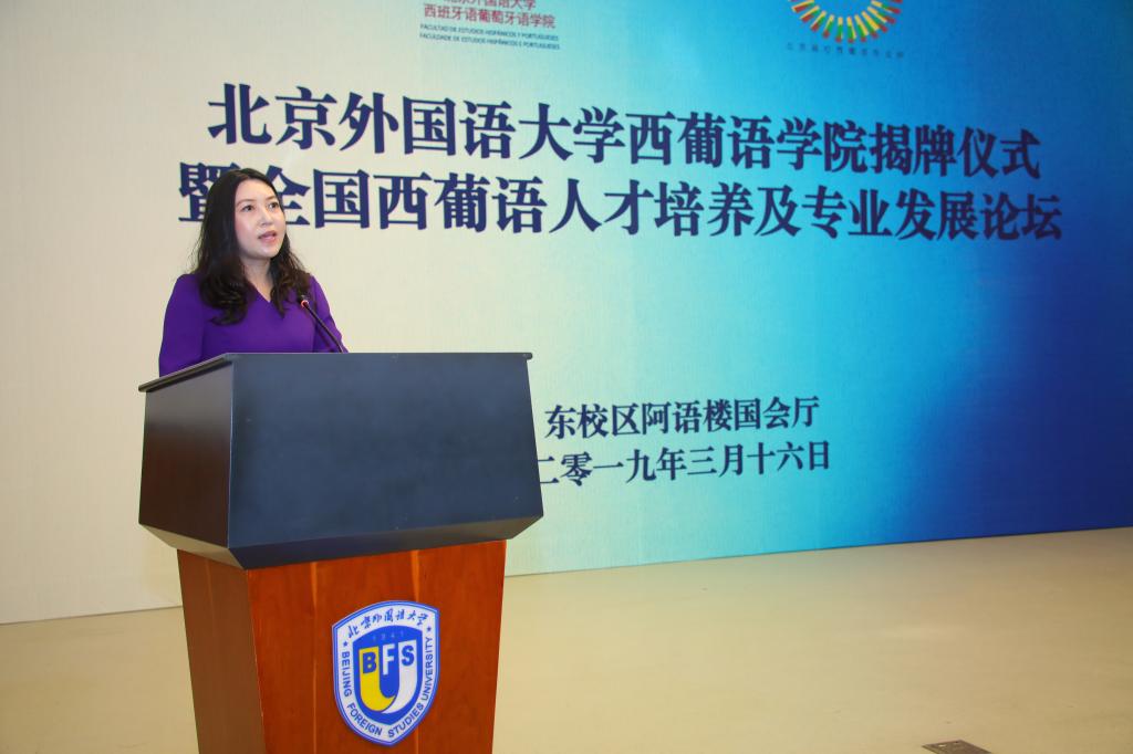 揭牌仪式后,还举行了两个专题发言。首先,北京第二外国语学院欧洲学院副院长张珂作了北京高校西葡语专业群工作回顾与展望。北京高校西葡语专业群成立两年来,参加了众多国内外交流活动,开展教师互访,加强师资力量,建设在线课程,取得了显著工作成果。张珂教授表示,未来,专业群要建立资源共享机制,开展在线交流,推动教师成长;同时创新人才培养模式,协同推进核心课程建设。