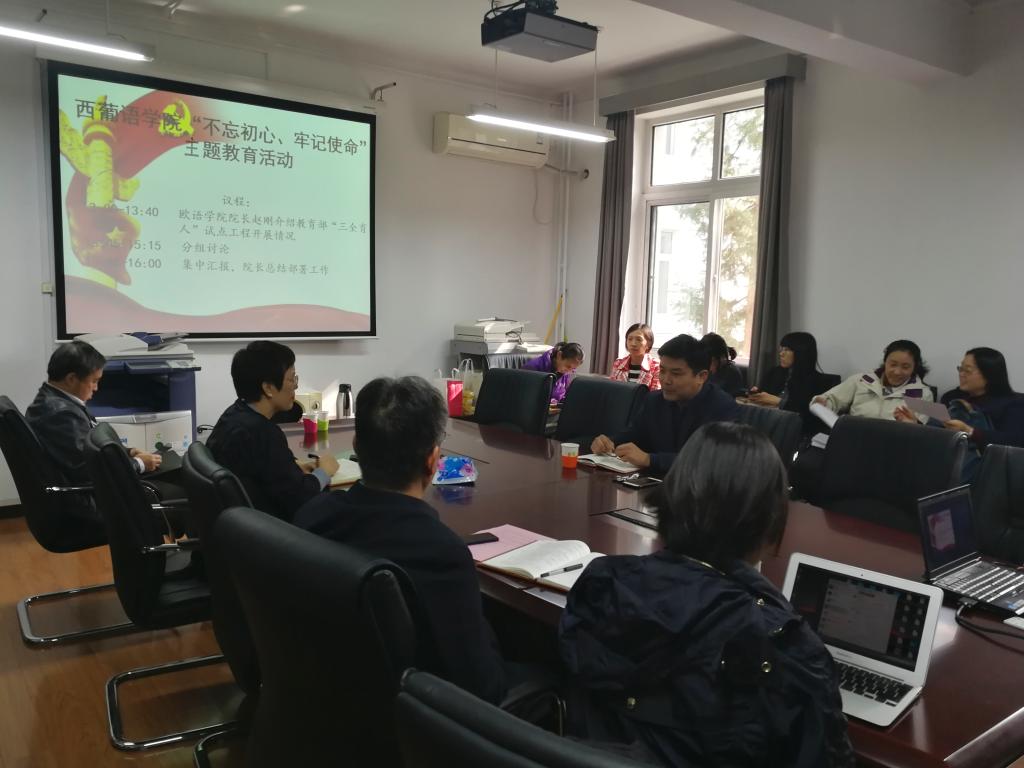 为深入学习贯彻习近平新时代中国特色社会主义思想和党的十九大精神,落实“不忘初心、牢记使命”主题教育要求,1023日(周三)下午,beat365党支部召开“立德树人”专题学习讨论活动,beat365全体教职工参加,党总支常务副书记孙眉主持。
