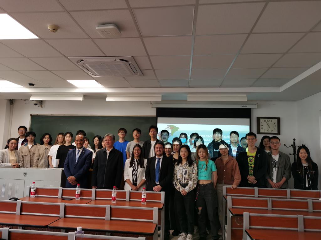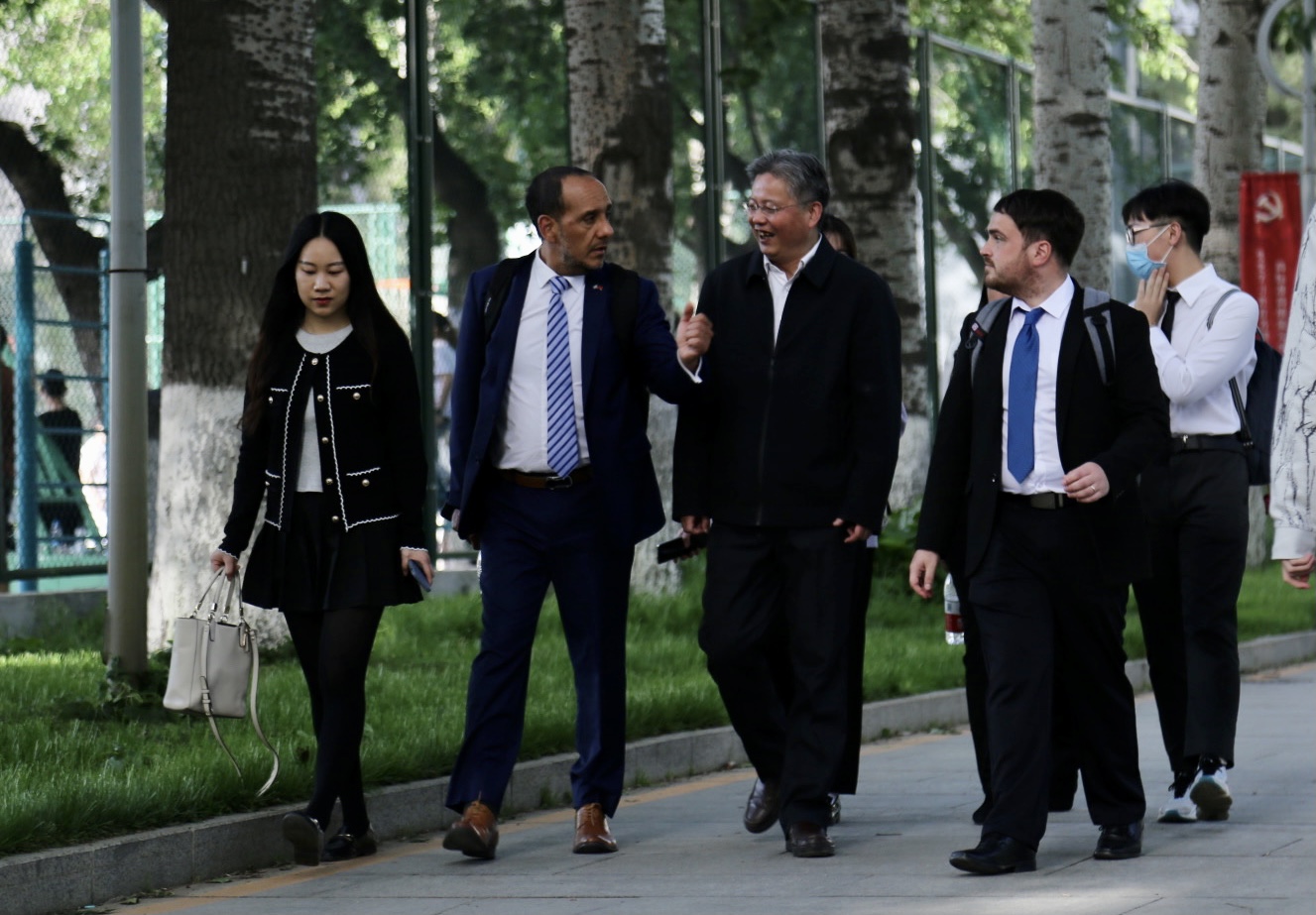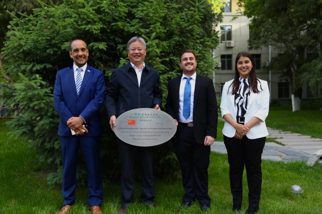 讲座结束后,在beat365院长常福良的陪同下,乌拉圭驻华使馆领事塞尔西奥·德亚巴列、潘慧敏老师、张哲海老师一起参观了北外校园的“中国—乌拉圭友谊树”。