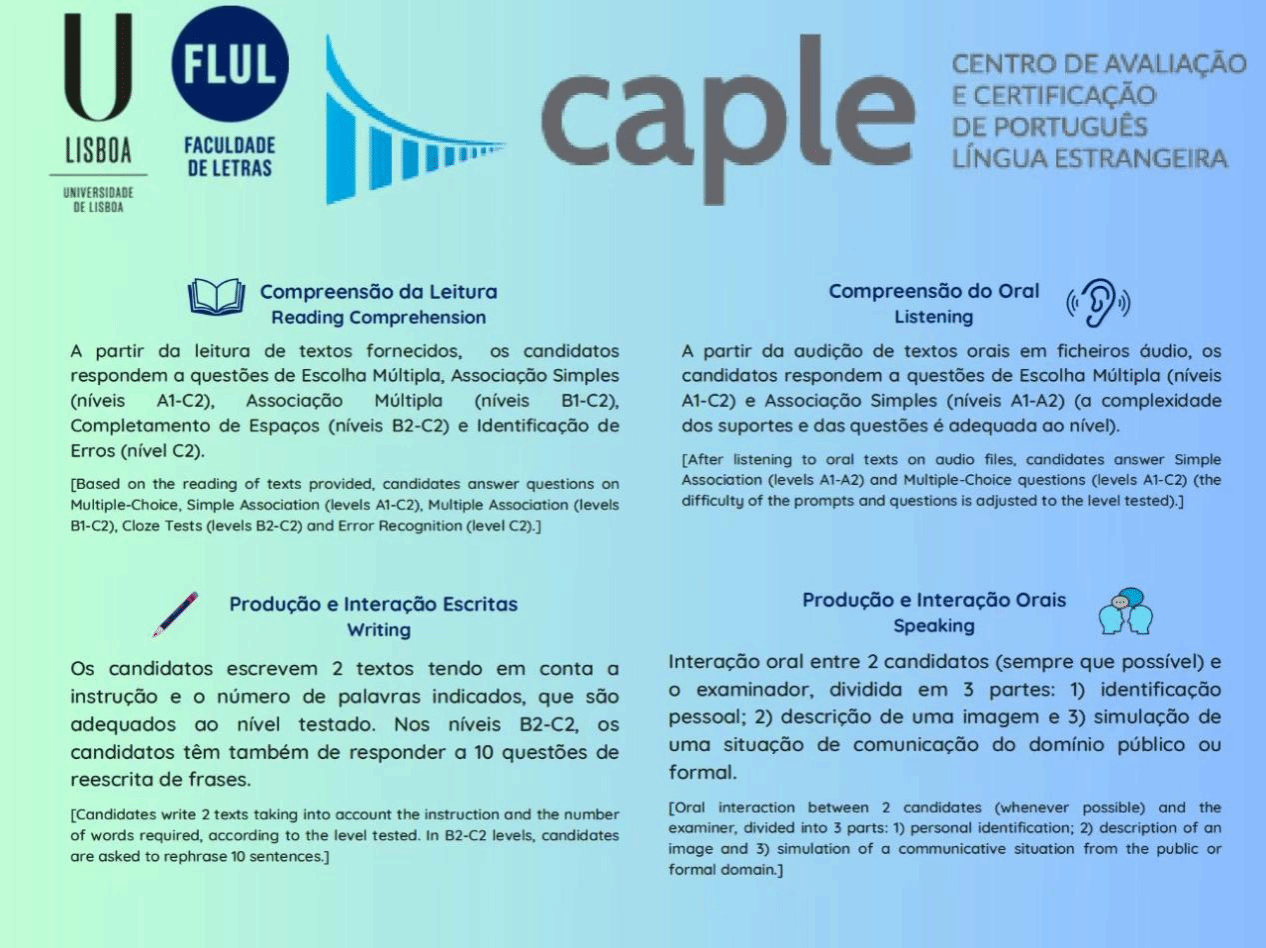 beat365中国官方网站CAPLE考点将于2025年5月6至8日举行CAPLE葡萄牙语水平测试。各级别开放名额分别为:CIPLE 16人、DIPLE 33人、DAPLE 26人、DUPLE 15人,报名截止日期为2025年4月14日。各级别具体考试日期请参见CAPLE考试中心官网(http://caple.letras.ulisboa.pt/)。